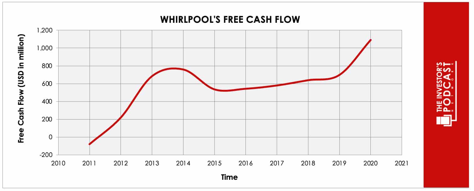 On the other hand, Whirlpool fits perfectly into the “box” for using a DCF model. In the below image, we can see how relatively stable Whirlpool’s positive Free Cash Flow generation has been.