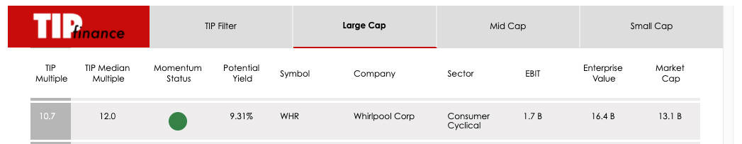 In our last Intrinsic Value Assessment, we looked at Autozone and I talked about how I was familiar with the business from the perspective of a customer but had never thought of it as a potential investment. It’s a similar situation with Whirlpool. As a homeowner and real estate investor, I’ve bought many appliances in my time, some of which were Whirlpool, some that were not, all giving me different perspectives on the appliance industry, companies, brands, and the appliances themselves. Then, the other day, I was using the TIP Filter function in TIP Finance tool as I researched for potential investment ideas when I came across Whirlpool trading at an attractive TIP Multiple, TIP Median Multiple, and a satisfactory Potential Yield, all with a green Momentum Status. I also thought about a recent newsletter I wrote about Peter Lynch and the advantage individual investors have over Wall Street.