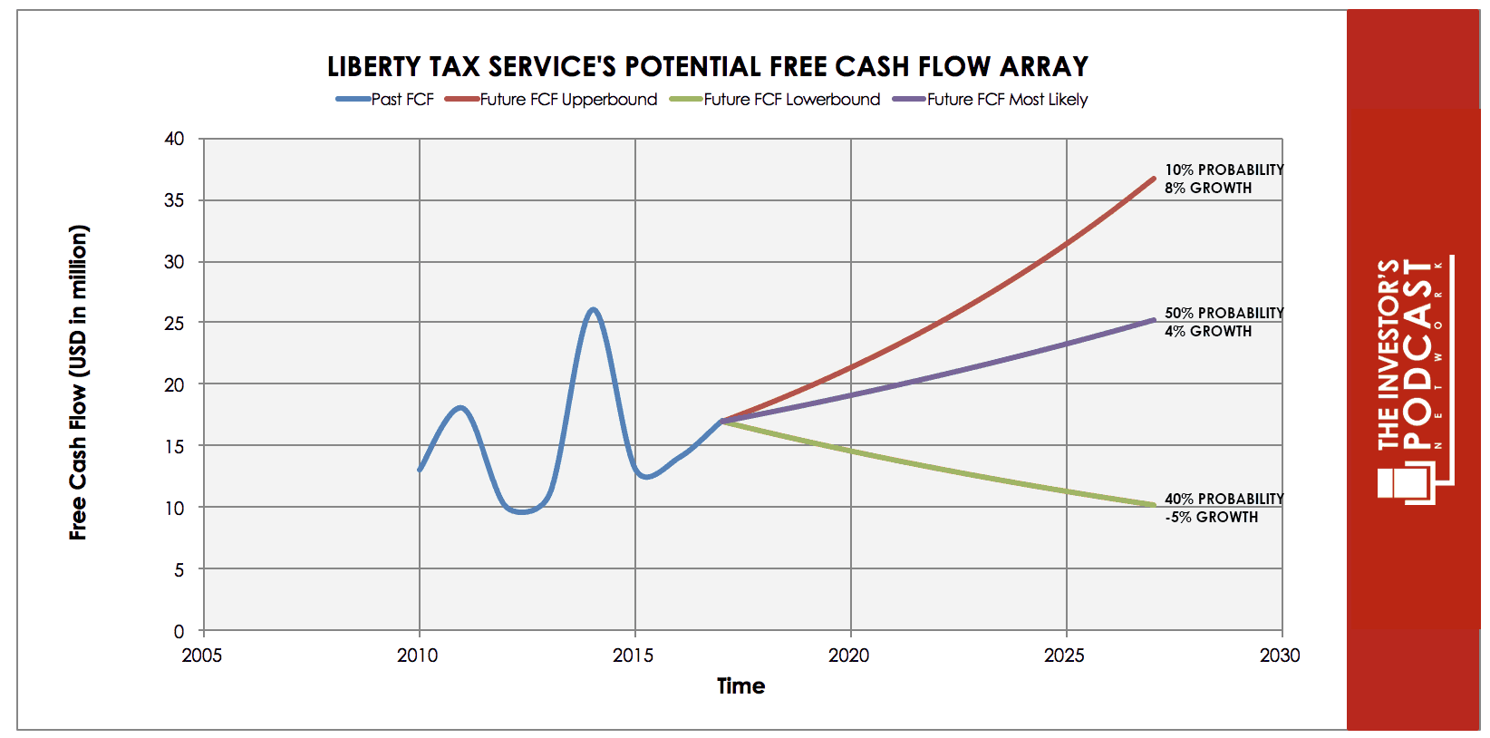 Each line in the above graph represents a certain probability for occurring. We assume a 10% chance for the upper growth rate of 8% per year. The most likely growth rate of 4% is based on the growth rate during the last seven years and is assigned a 50% chance. We assign a 40% chance to the possibility of a 5% annual contraction.
