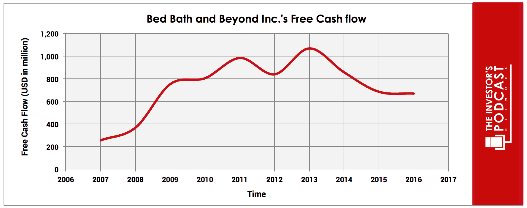To determine the value of Bed Bath & Beyond Inc., let’s start by looking at the company’s history of free cash flow. The free cash flow is important because it represents the company’s ability to retain earnings and grow the business. Most importantly, it demonstrates a return that might be invested in the ownership of equity of the business. Below is a chart of BBBY’s free cash flow over the past ten years.