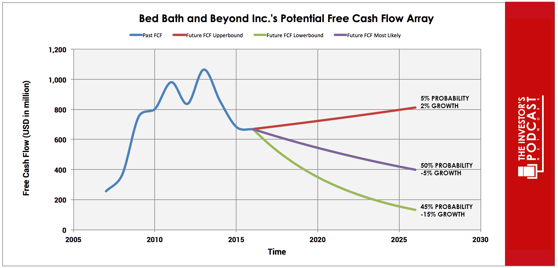 Each line in the above graph represents a certain probability for occurring. We assume a 5% chance for the upper growth rate of 2% per year, a 50% chance for a decline of 5%, and a 45% chance for the worst-case scenario of -15% annual growth.