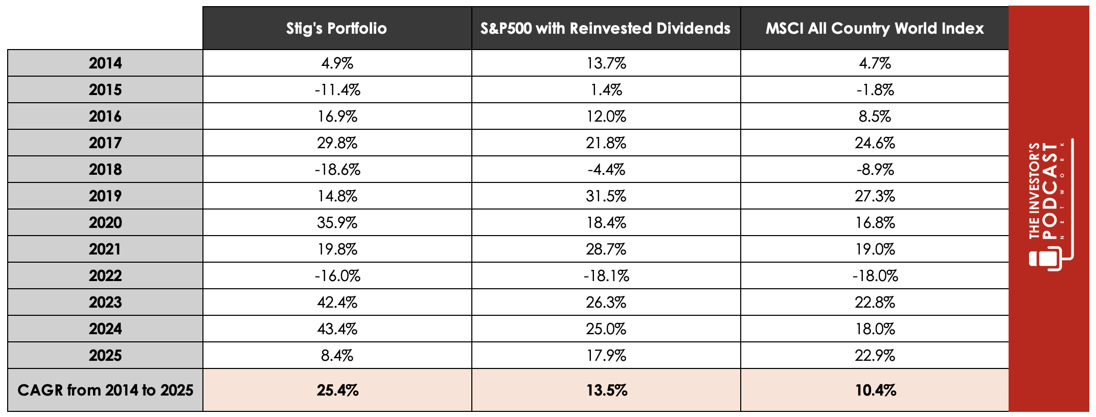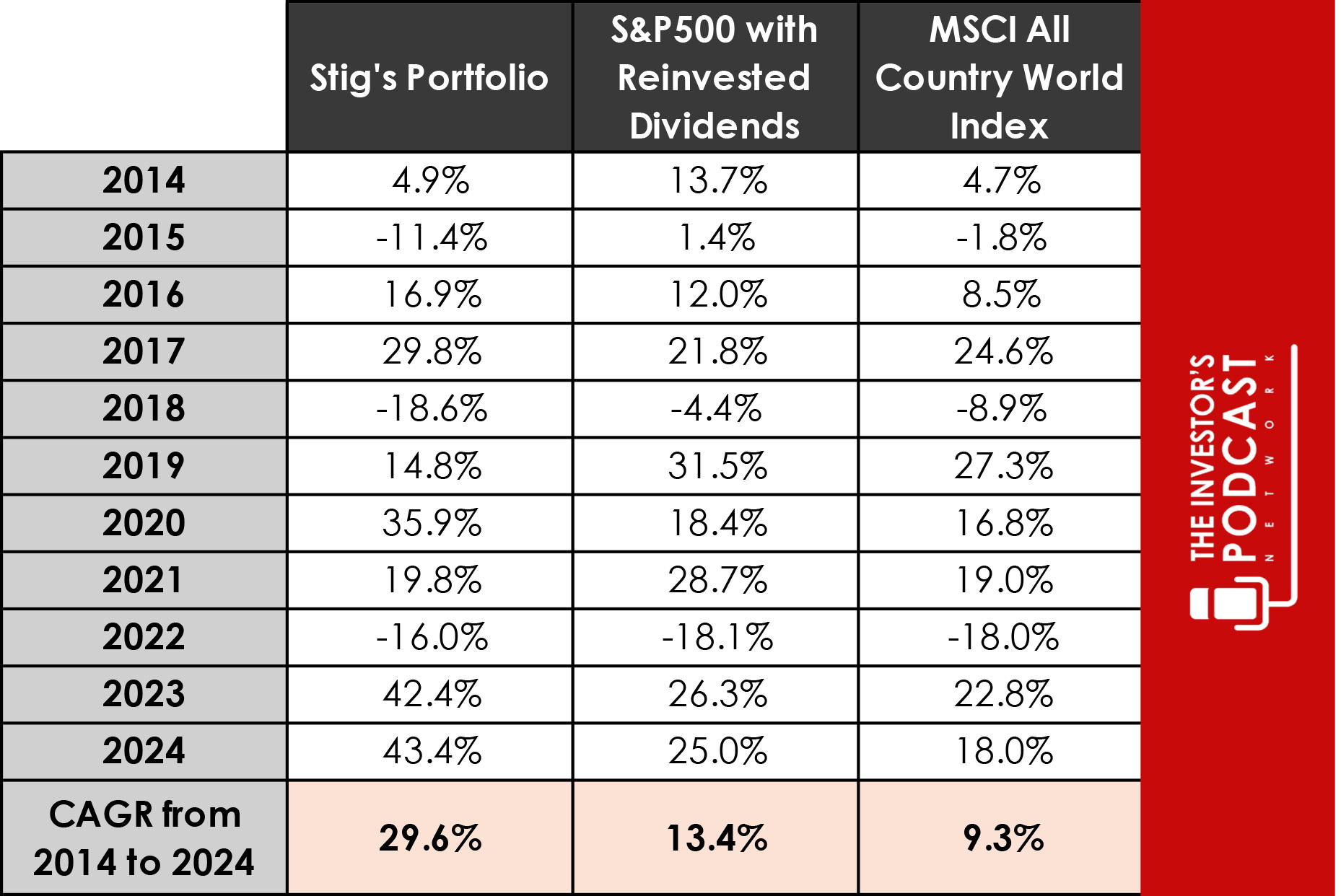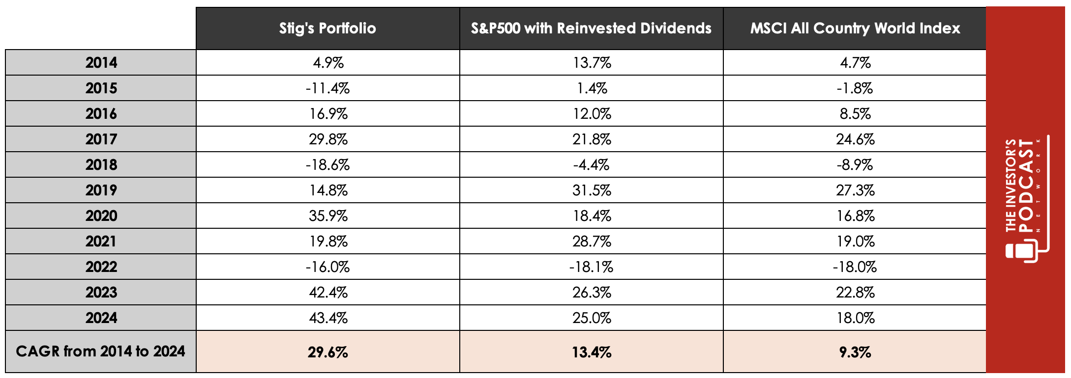 Let’s turn the tables and imagine the other scenario where I, after a decade, did not beat the MSCI All Country World Index. One could quickly conclude that I shouldn’t host a show about stock investing. After all, why listen to me when you can just buy an ETF? While it’s certainly a valid opinion, it would defeat the purpose of what we want to achieve with TIP. The hosts of We Study Billionaires do not intend to have their positions copied. Rather, we interview and study the best investors and learn alongside our audience.